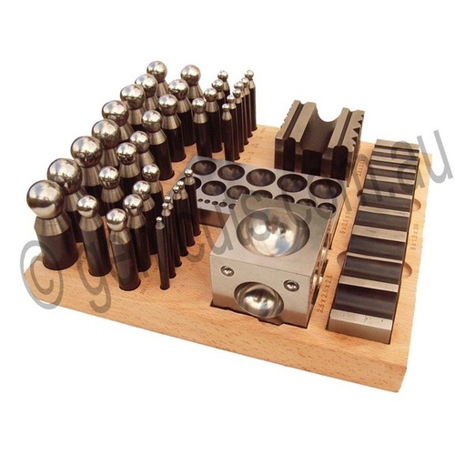 - 36 doming punches, made from hardened steel, in approximate sizes 1 (3.5mm) to 36 (24.5mm).