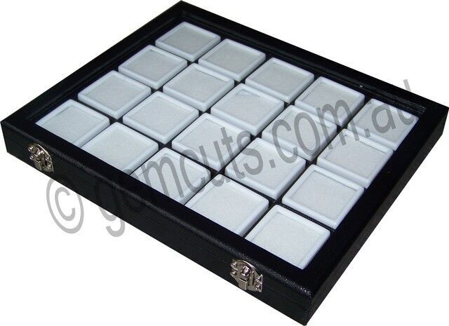 Quality leatherette box for displaying gemstones, coins, beads or findings and protecting them from the environment.