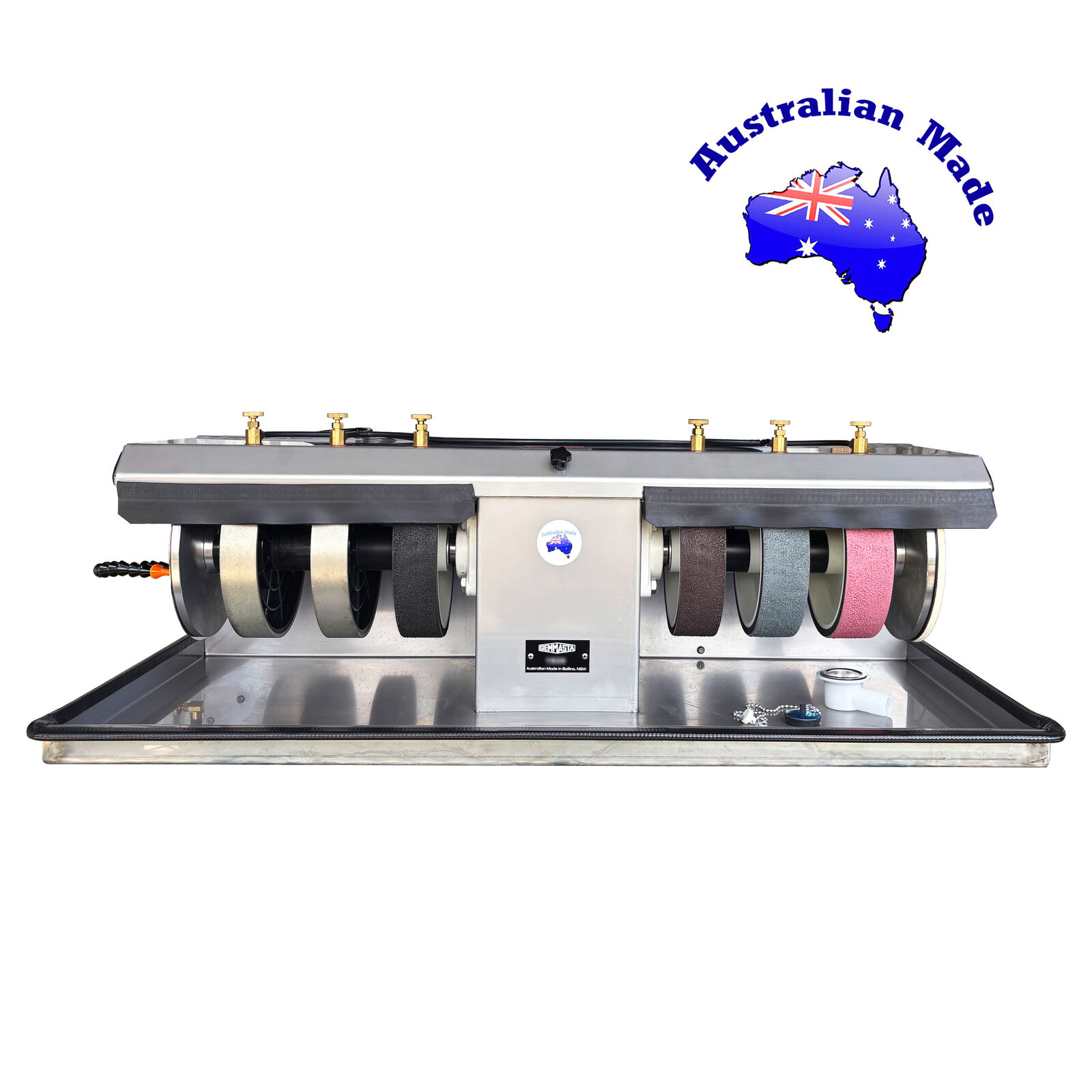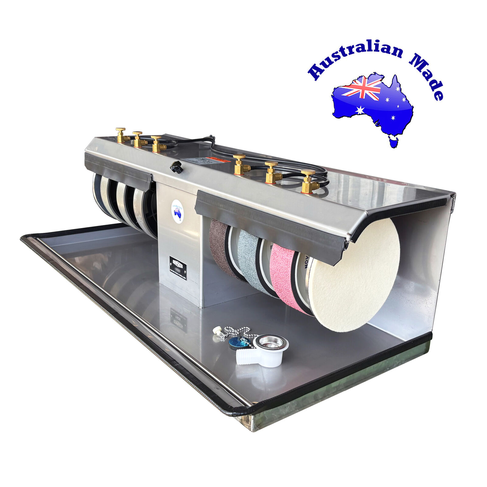 Our ProCabber cabbing machines are Australian made in Ballina NSW. They are fully stainless steel in construction, including the shaft and bearings! Both the motor and the shaft pulleys have keyways to prevent the pulleys from slipping. ProCabbers have a longer shaft than less expensive imported machines, enabling greater spacing between the wheels. This allows much better access to the edge of the cabbing wheels.