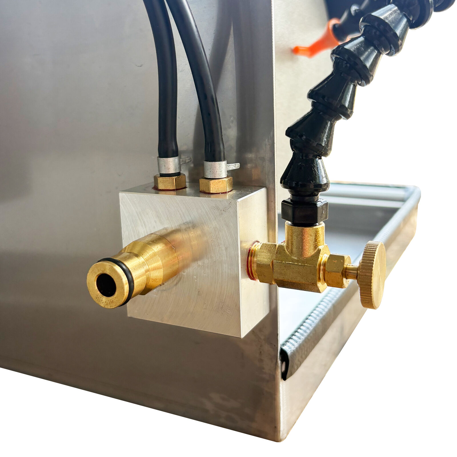 Newly upgraded fully brass needle valve water taps with tubing that leads to an aluminium manifold.