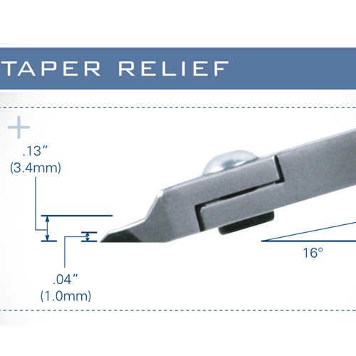Razor Flush Cutting edges with adjustable edge wear protection. Taper head cutters are very popular. The pointed head allows for increased cutting access yet has sufficient strength to avoid tip breakage when used within its capacity. Cutting Capacity Soft Copper Wire Diameter .004” — .035” .1mm — .9mm 38AWG — 19AWG